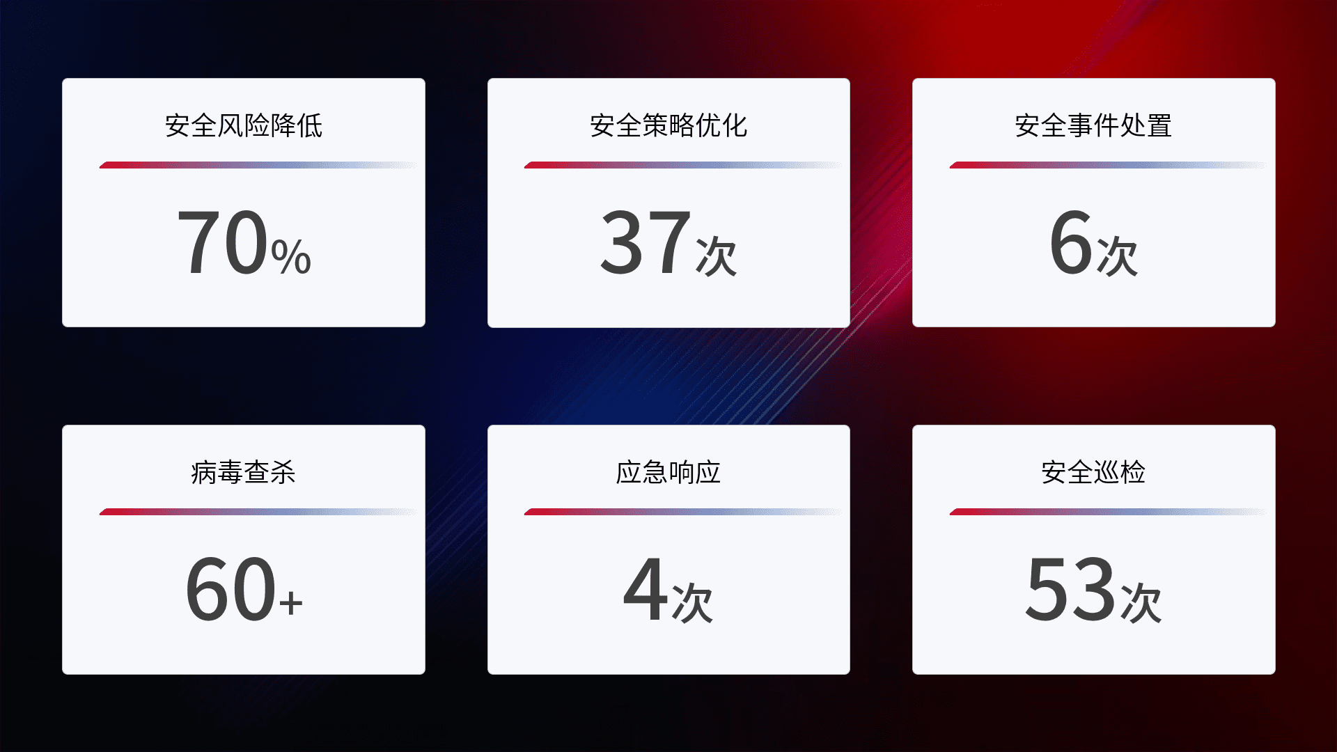 提供全面的安全事件报告体系,,,包括处置报告、、、、周报、、季度和年度总结,,,,结合持续监控,,,,帮助客户深入了解网络安全状况。。。