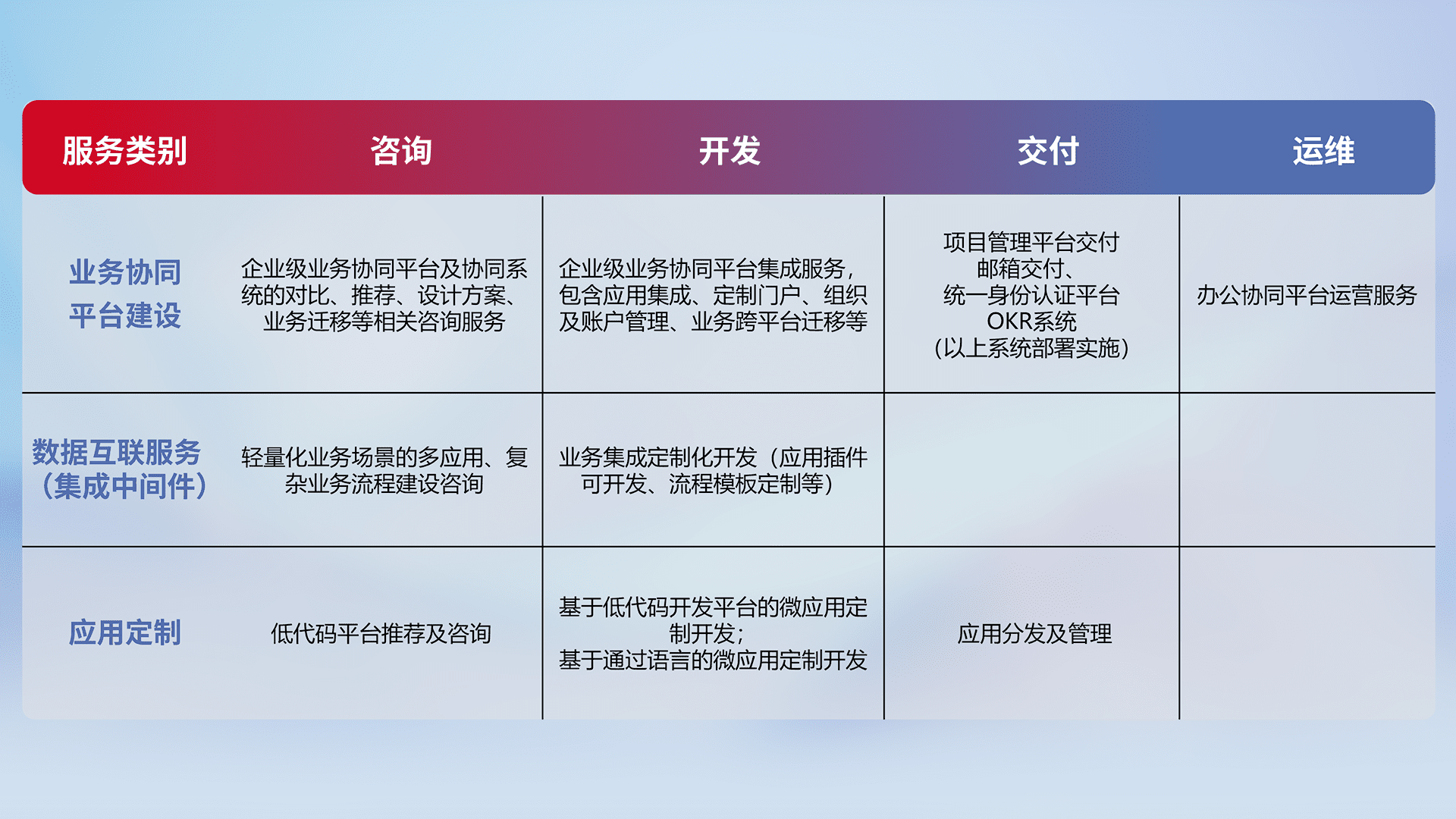 针对钉钉、、、、企微、、、IDaas等平台级产品提供产品的规划、、方案、、、、交付、、定制化开发等服务,,,,实现如统一协同办公、、、、智能客户服务、、、、混合会议管理、、智能数据查询、、等业务场景,,,实现数字化转型。。。。